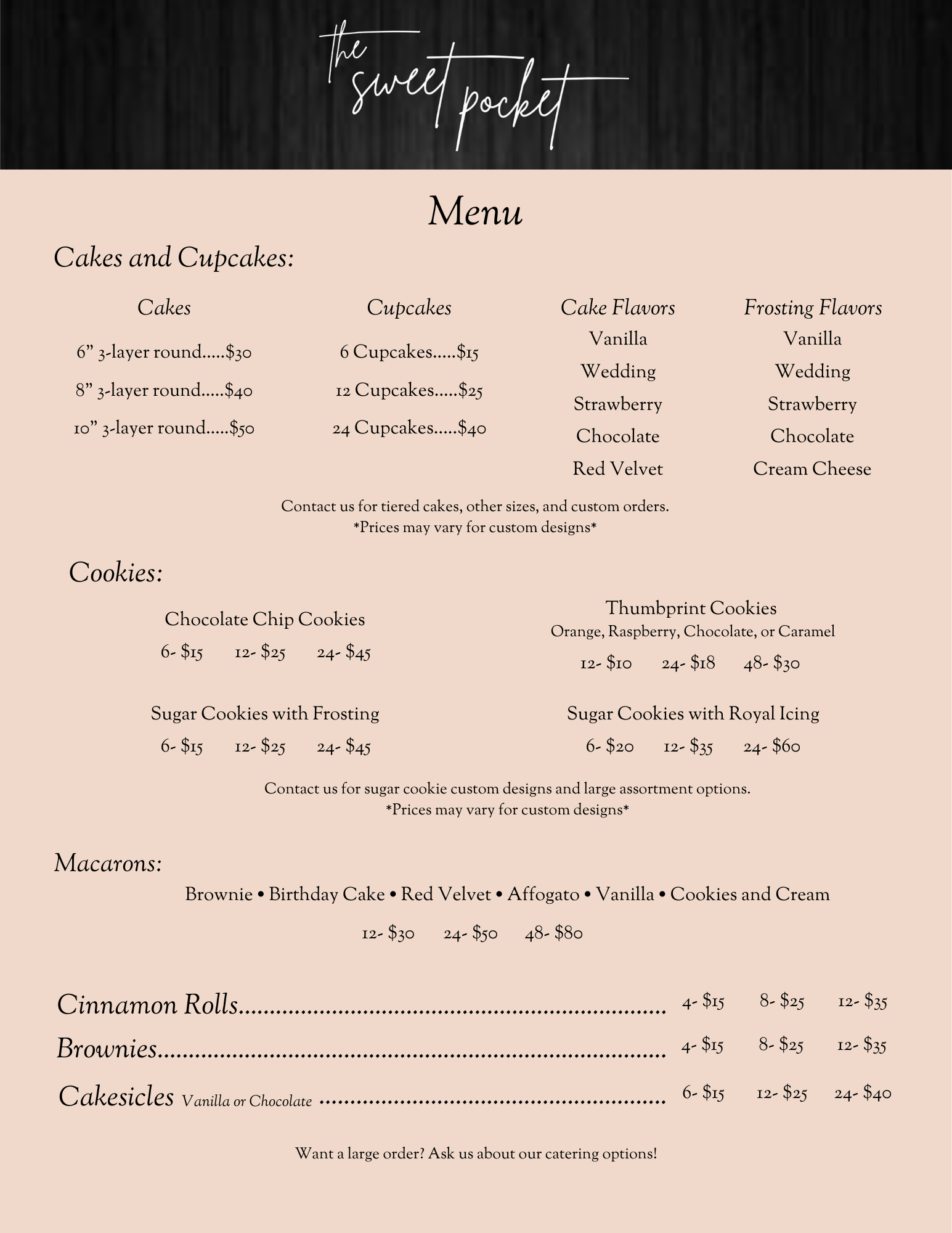 Take a look at our menu, then email us at contactus@thesweetpocket.com with the date you would like to receive your order and what you would like. We will shortly reach out to you with a confirmation and payment options. You can also email us for custom orders and we will work with you for all your sweet treat needs!